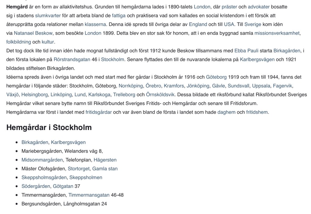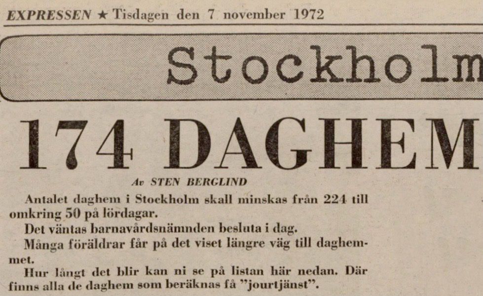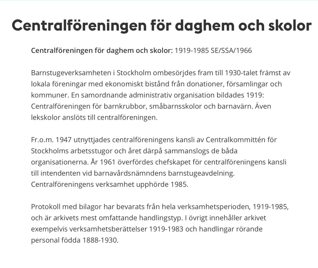 ”Den som följt med i Dagens Nyheters spalter vet att under den senaste tiden en del anmärkningar riktas mot den Hedborgska stiftelsen framförallt därför att den i som princip tycks vilja helt och hållet avskära barnen från deras mödrar då denna senare ser sig tvungna att lämna dem till utackordering. Denna princip är ju egentligen också bestämmande för det annars såsom institution sett mycket välskötta allmänna barnhuset. Bland dem som på närmare håll satt sig in i barnavården och därmed sammanhängande problem framträder emellertid allt starkare ett annat önskemål, som går i den raka motsatta riktningen, nämligen att i möjligaste mån arbeta för att bibehålla sambandet mellan mödrar och barn. Detta av både samhälleliga och individuella skäl. Svårast ställer sig naturligt nog detta problem då det är fråga om ensamställda mödrar, som för sig och sitt barns utkomst måste tillbringa hela dagen utomhus i arbetet. Hur skola det på samma gång kunna fullgöra sitt arbetetsåliggande och samtidigt ge sina barn under uppväxtåren den vård som denna så väl behöva. För att räcka en hjälpande hand ha sådana institutioner som det spridda barnkrubborna, barnvärn o.s.v. kommit till stånd.