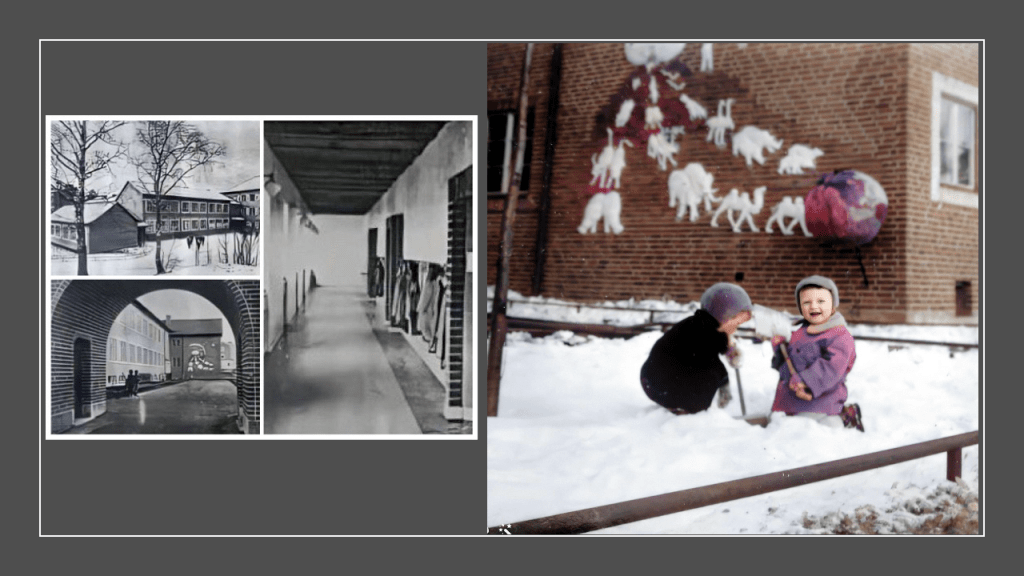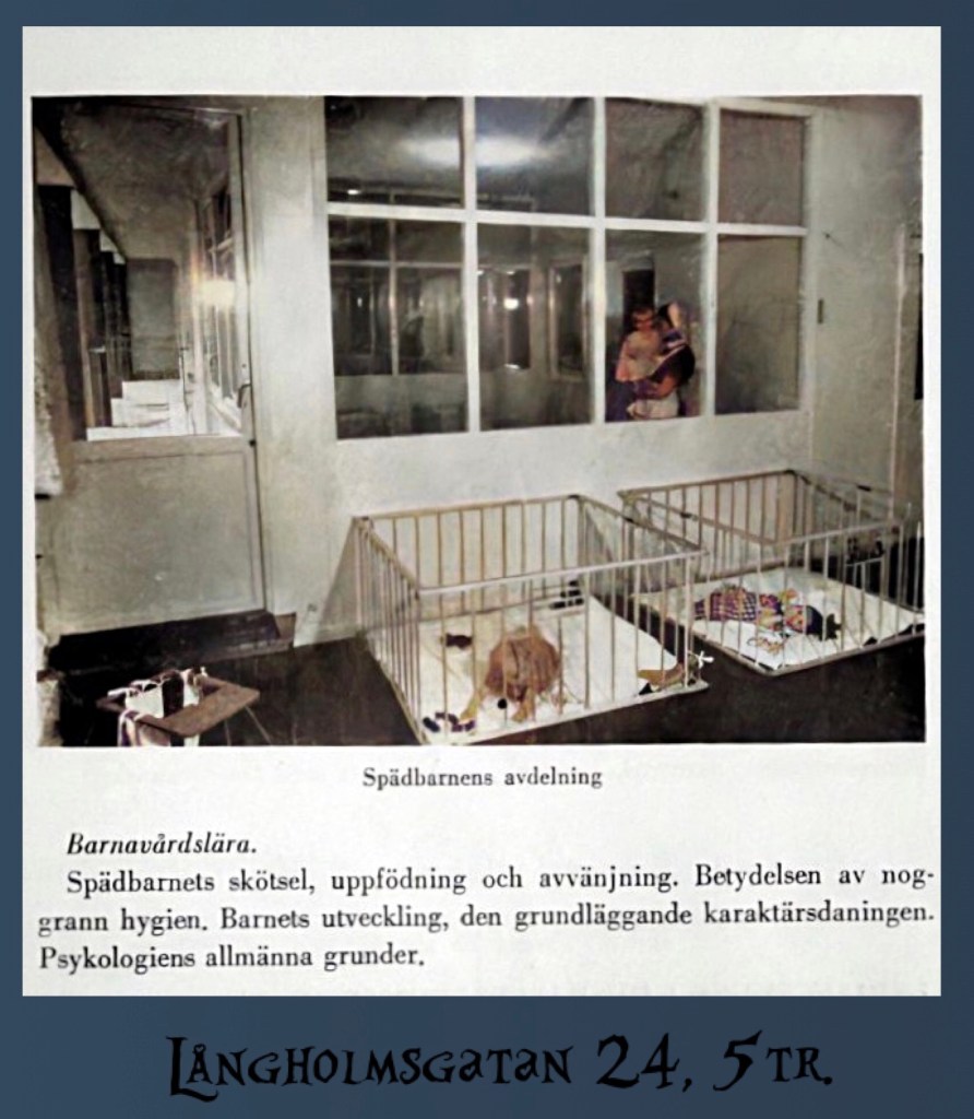 Jag är ganska säker sista fotot är taget på våning fem i huset. Det är alltså dåvarande Husmorsskolan’s spädbarnsavdelning för att sedan bli Bergsundsgården’s späd och kolt avdelning på samma våning. Följt av Idéforum i slutet av åttiotalet och nu är det Bergsundsskolan’s våning vid namn Freja som finns i lokalen.