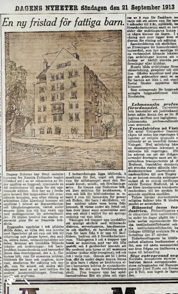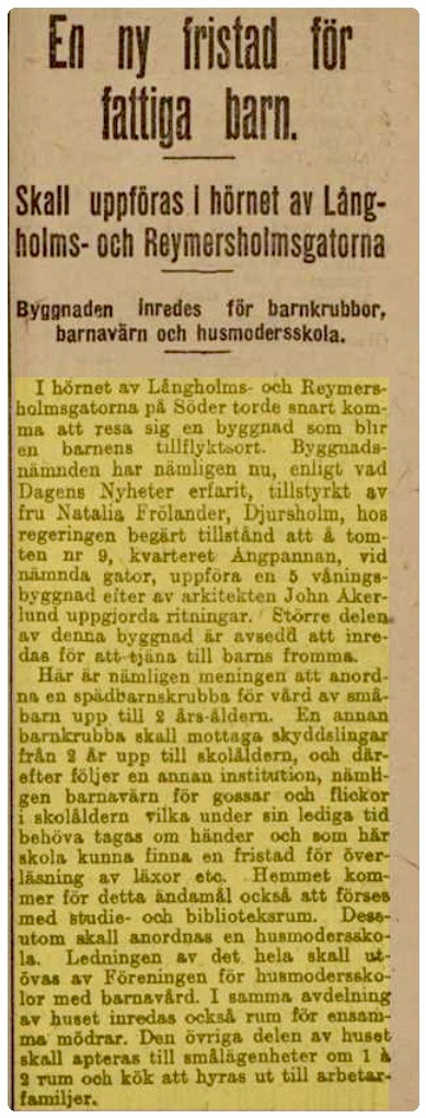 ”Dagens Nyheter har förut omtalat hur som fru Natalia Frölander begärt tillstånd att i en av utkanterna av Söder uppföra en byggnad, rymmande en del institutioner till gagn för de uppväxande släktet. Hon har nu i fredagens konselj fått byggnadslov till ovanstående komplex, som efter ritning av arkitekten Johan Åkerlund kommer att uppföras i hörnet av Reimersholms- och Långholmsgatorna, varest under senaste tiden hus vid hus vuxit upp med smålägenheter för arbetarfamiljer. På höjden bredvid har staden reserverat plats för framtida folkskola.