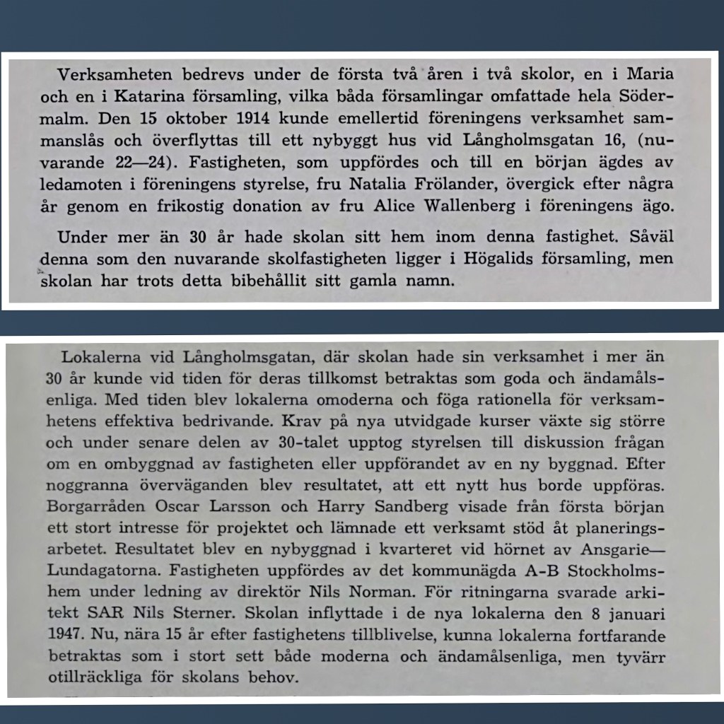 Först höll föreningen till i olika skollokaler i Maria och Katarina församlingar. 1914 flyttade man till Natalia Frölanders nybyggda hus på Långholmsgatan 22-24. När verksamheten växte alltmer behövdes det större lokaler och 1947 invigdes de nya lokalerna på Ansgariegatan 2”.