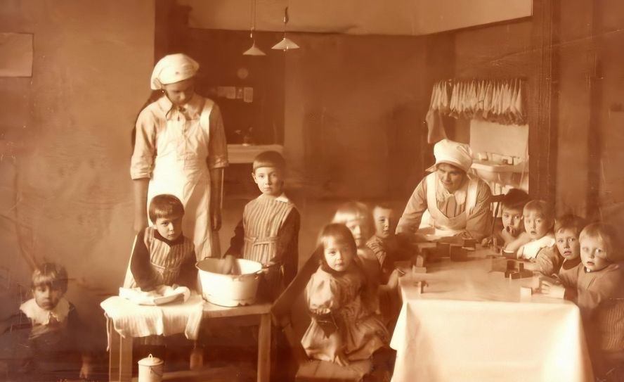 ”Från början var verksamheten enbart inriktad på matbespisning för fattiga barn under 7 år. Barn till yrkesarbetande mödrar blev ofta lämnade ensamma hemma och deras mat var bristfällig och näringsfattig. Därför bildades en förening för att hjälpa barn att få bra och näringsrik mat under dagen. Så småningom utvidgades föreningens verksamhet till att dels under dagtid ta hand om barn till mödrar som förvärvsarbetade och dels avgiftsfritt utbilda flickor i husligt arbete och barnavård. Föreningen blev på så vis en kombination av ”daghem” och husmodersskola.