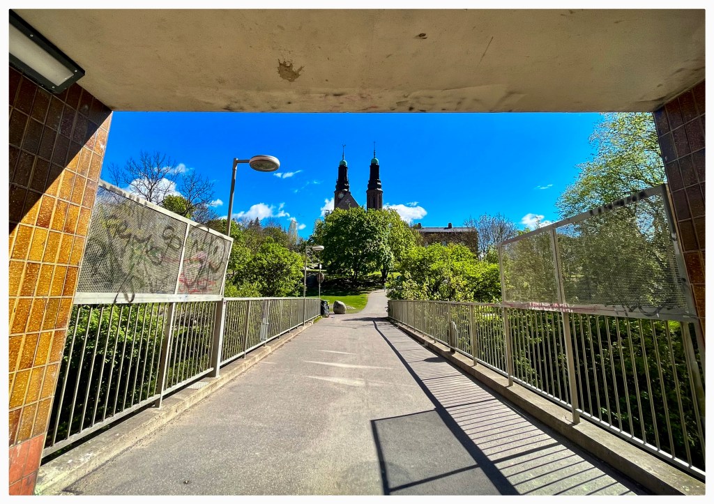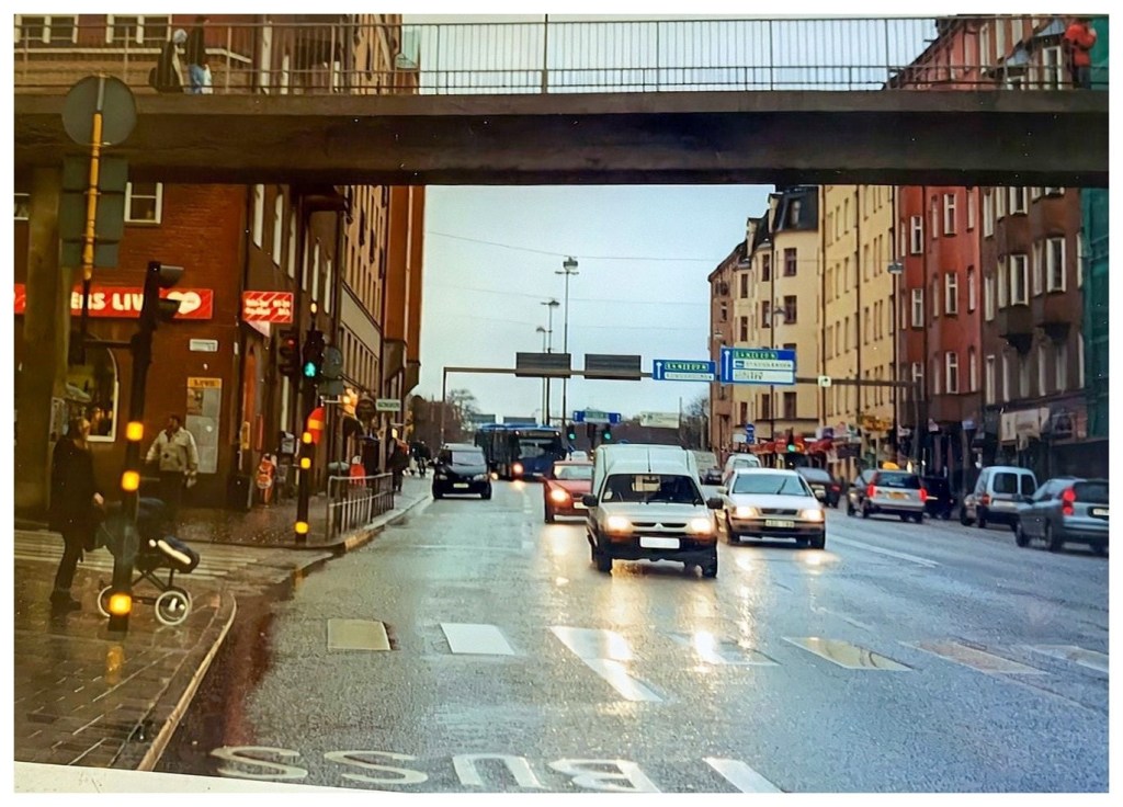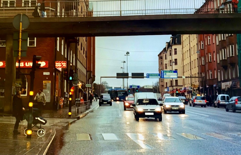 ”Vid foten av Västerbron, där den landar på den södra stranden. Långholmsgatan. Smala trottoarer, bullrig trafik, bromsande bussar, transportbilar på tomgång, en oändlig ström av personbilar till eller ifrån.