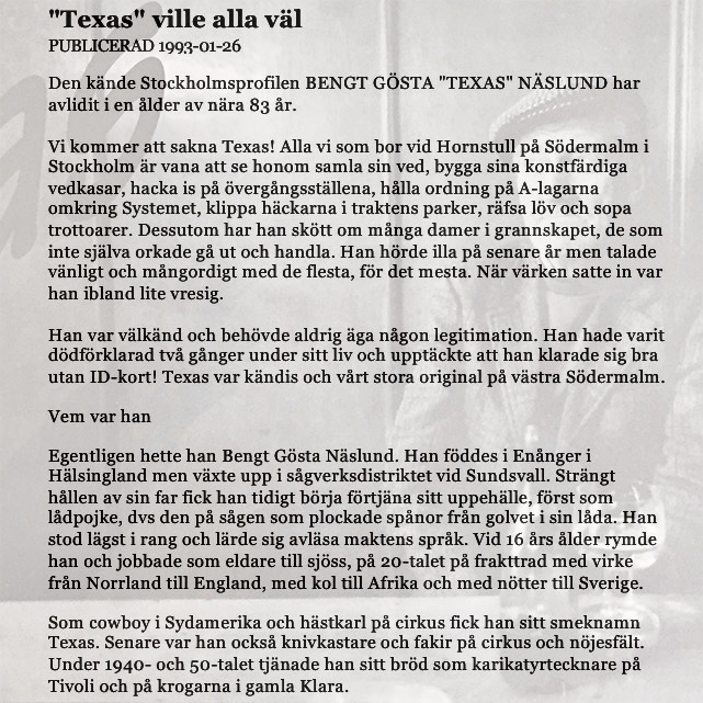 Min moster hette Anna och var född i Ytterlännäs och min morbror hette Sixten och var född i Bjertrå. Hos dem var jag och syrran inhysta varje gång det blev dags för vår mamma att åka in till Södersjukhuset för att få behandling för sin allvarliga muskelsjukdom (Myastenia gravis). På grund av den sjukdomen blev mamma sjukpensionär i väldigt unga år. Har inget minne av henne under de två första åren av min uppväxt när hon ännu inte blivit sjuk. Så för mig har hon alltid haft den här sjukdomen.