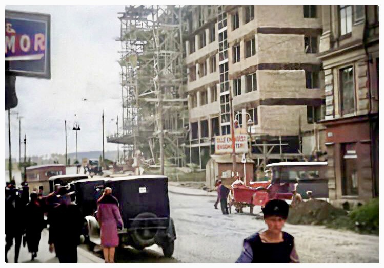 Folkskolegatan ner mot Långholmsgatan och Maria Husmodersskola, någon gång i början på 30:talet. Fotot kommer ifrån SvD, Digitala Stadsmuseet och har tagits fram av Odd Sigurdsen. Jag har förbättrat och färglagt bilden i MyHeritage app.