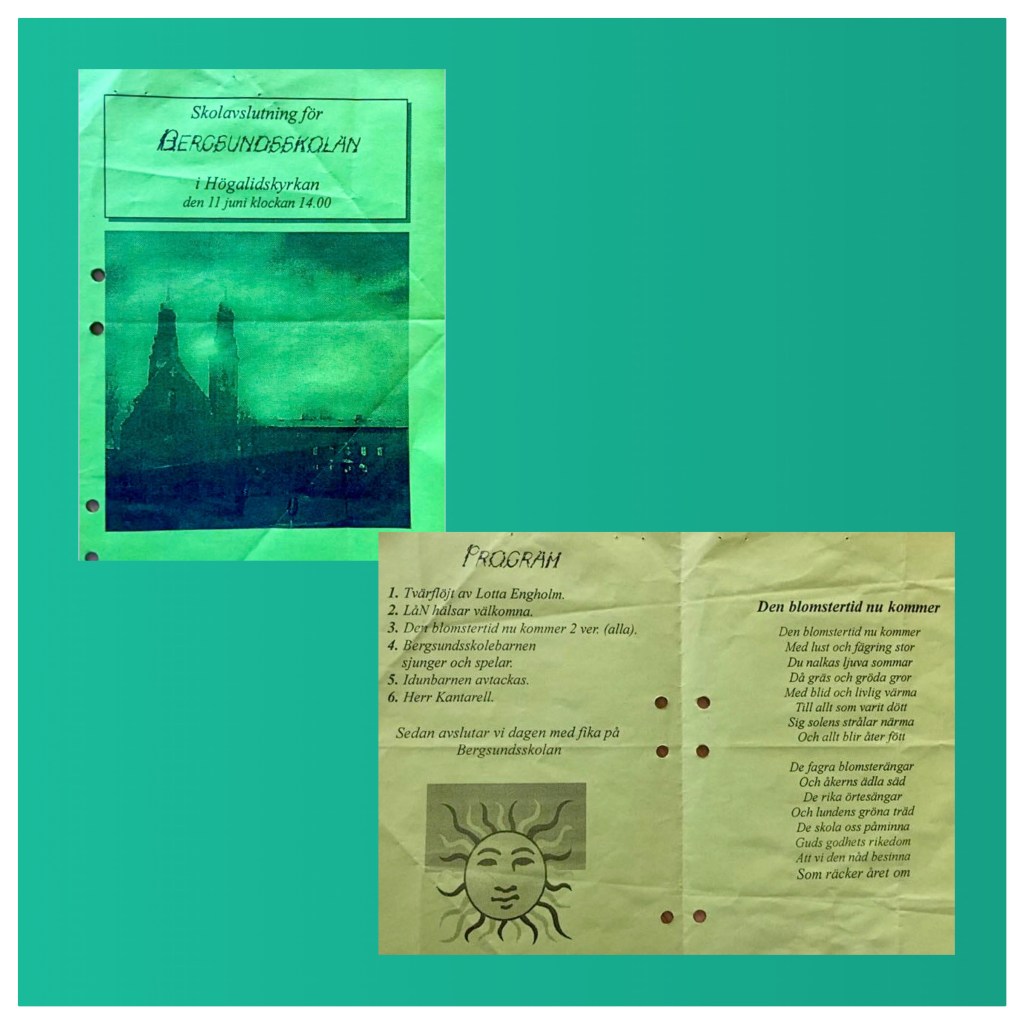 Kommer också ihåg morgonsamlingar på måndagarna. Vi startade med en grupp med 22 barn och fyra vuxna och med fullt utbyggd skola var vi 104 barn och 12/13 vuxna uppe i den så kallade ”Motoriken”. Vi började alltid med att alla sjöng Bergsundsskolesången. Sedan berättade vi hur veckan såg ut i respektive grupp därefter gav vi varje barn möjlighet att kortfattat berätta vad de hade på hjärtat. Samlingarna avslutades med att jag berättade en morbror Sixten historia, till exempel den här: