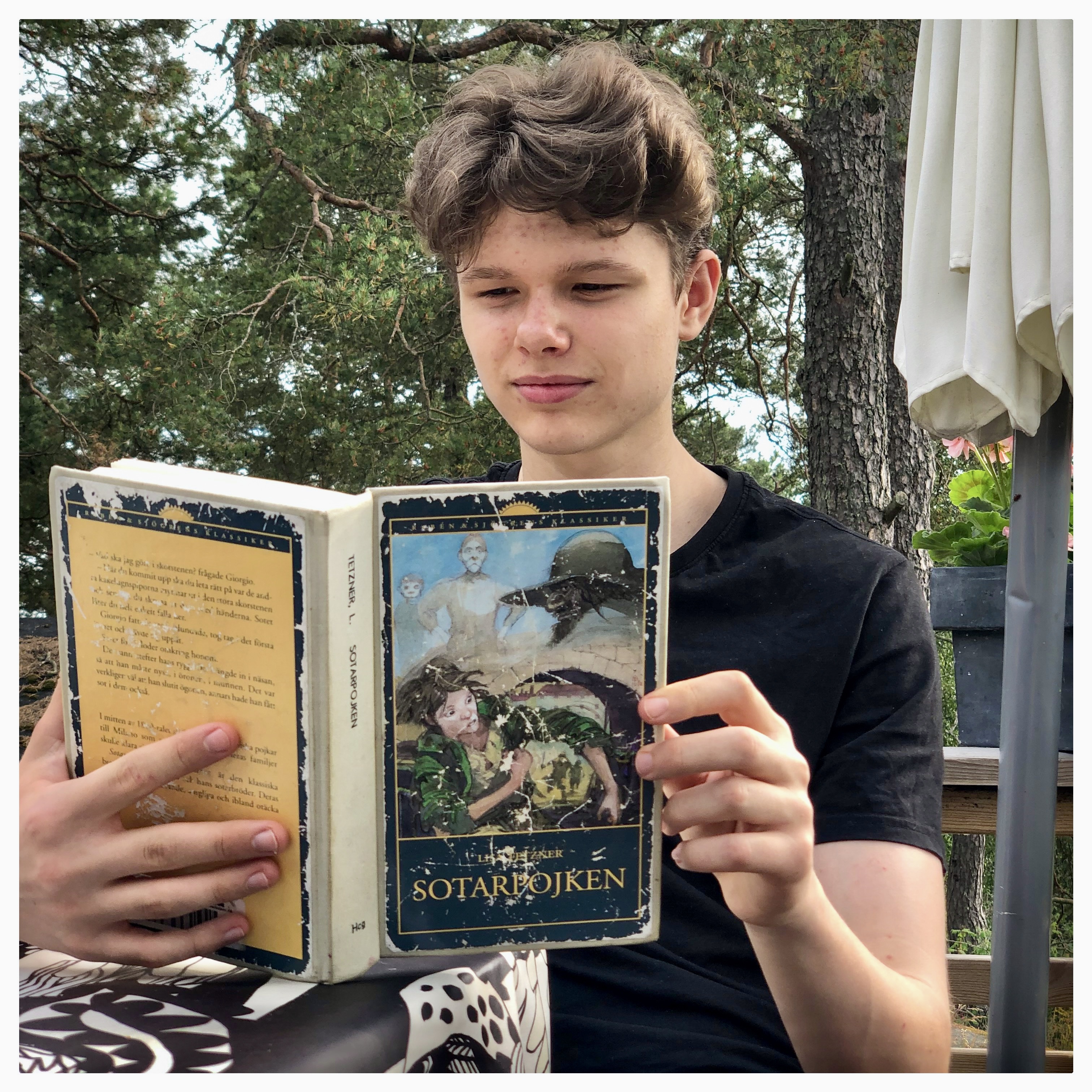 Anton heter han och går i femman. Han sitter på en pinnstol. Jag lutar mig tillbaka i den fluffiga soffan mönstrad med iris, liljor och slån. Han ser ganska bestämd ut denna unga man. Och hans röst och ord är också bestämda. Han talar om regnskogar. Han har besökt regnskogar i Costa Rica.