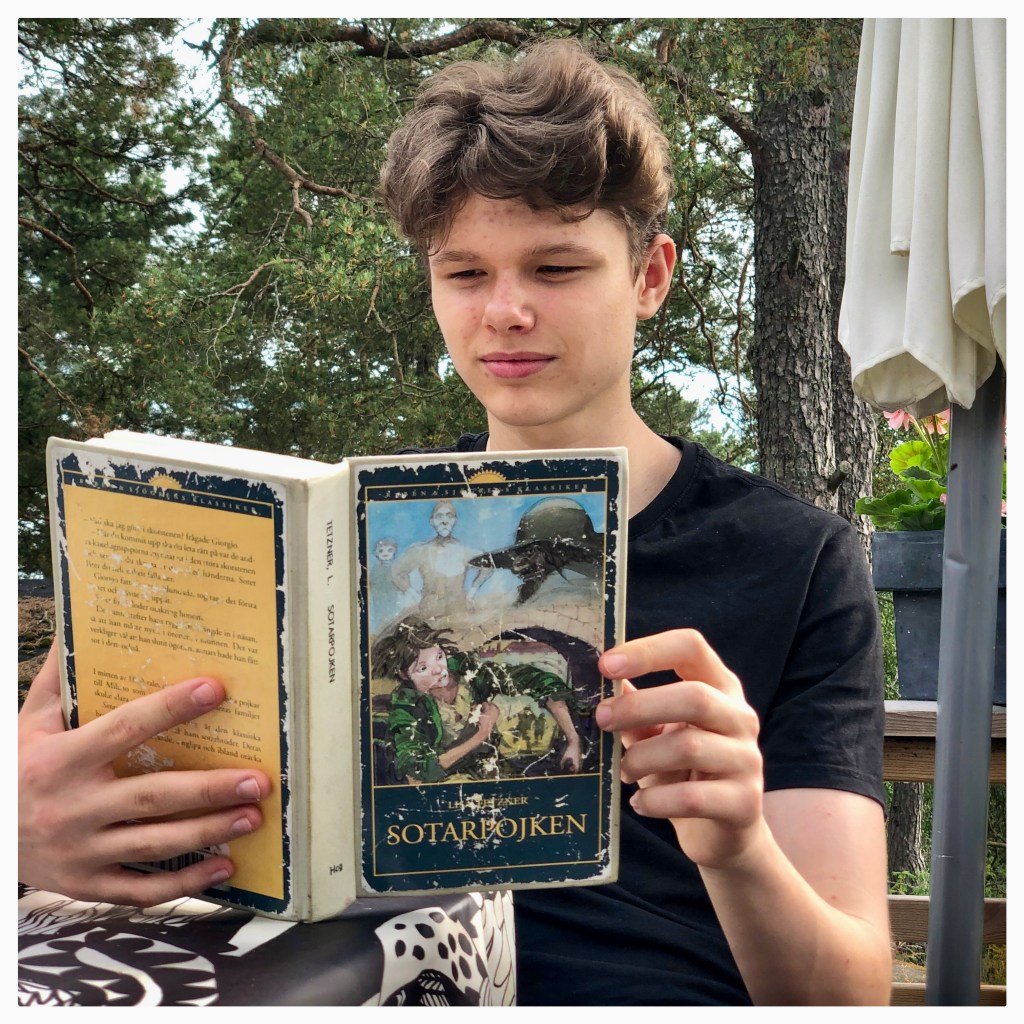 - Jag skriver om en pojke från Sverige som flyttar till Afrika. Han jagas och retas för vitskalle av barnen där. Just nu är han tillfångatagen och fastbunden vid en påle. Jag har inte kommit längre.