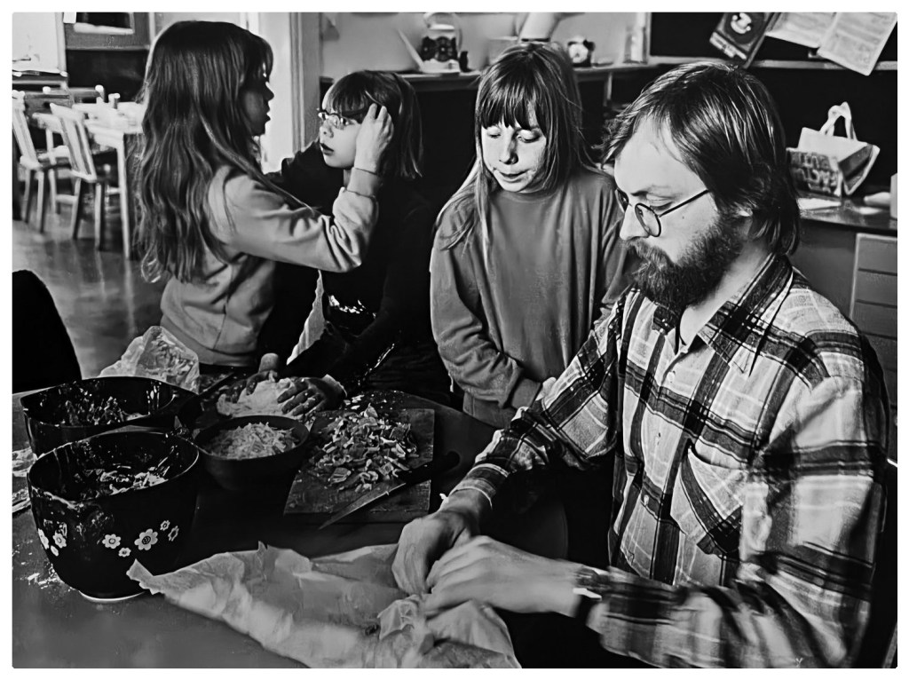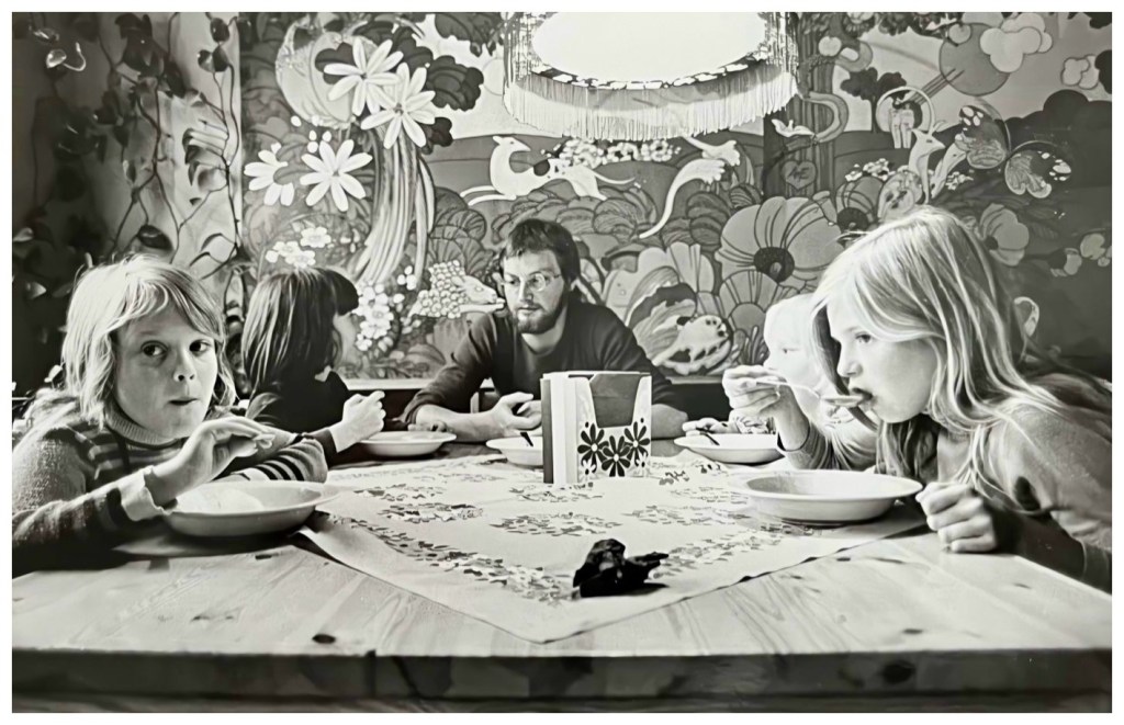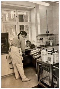 Jag har hittat egna bilder från slutet av sjuttiotalet, eller kanske början på åttiotalet, som visar vilka som arbetade i köket och även när vi äter i personalmatsalen. På bilden längst ner till vänster ser vi vår föreståndare Evy.