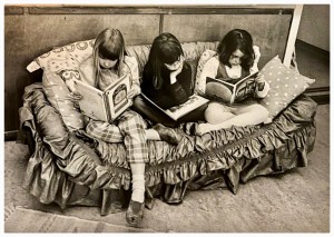 I den ljusblå soffgruppen med diagonala ränder sitter koncentrerade flickor och läser Kalle Anka. Pastellfärgade kuddar, pastellfärgade tröjor Korviga strumpor. Pixiband i håret.