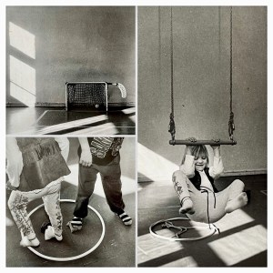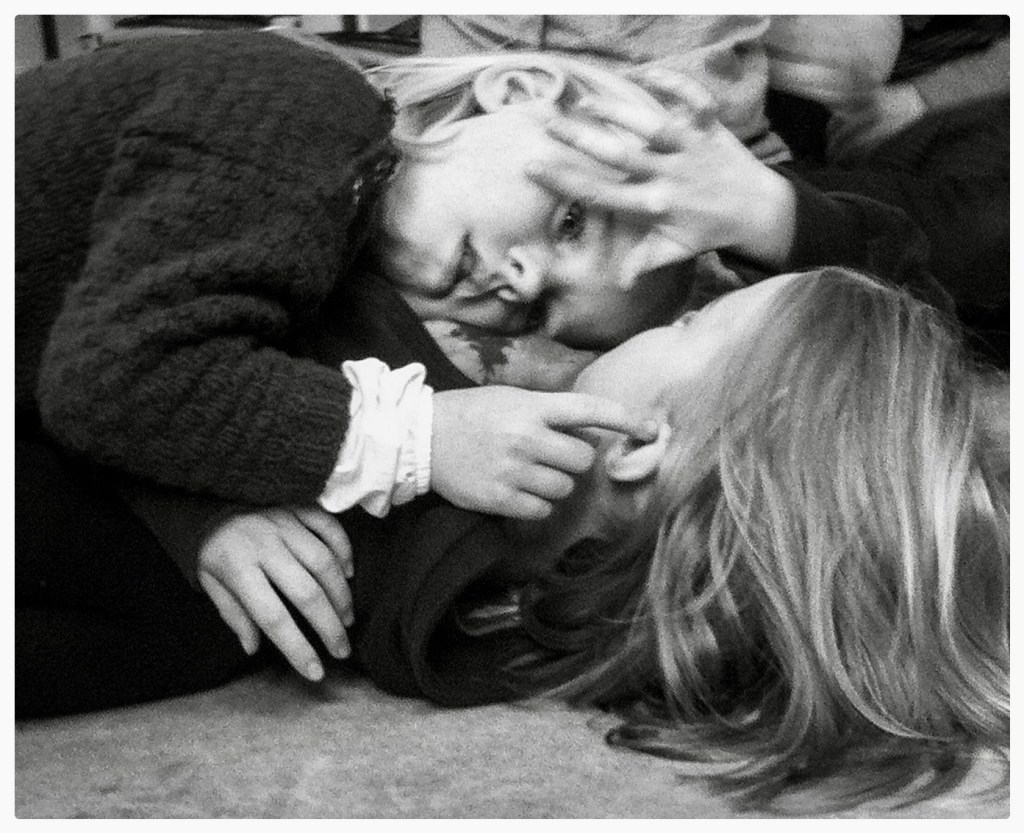 På den blå hallmattan rullar två flickor runt i vilt slagsmål. De skrattar och tjoar och flyger runt oss i sina cerisefärgade collegetröjor.