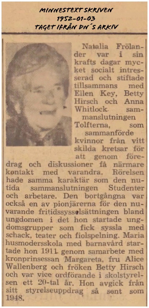 När Natalia Frölander dog 1951 (93 år gamma) sörjdes hon av många, inte minst av sin fosterdotter Maj. Nu vilar hon på Djursholms begravningsplats i Stockholm.