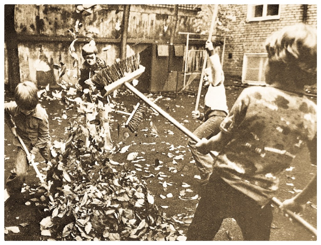 De rosa förklädena dyker bland upp som vålnader och ber barnen att inte bruka våld. I det tonfall man har när det är femtusengånger och man vet att det blir femtusengånger till.