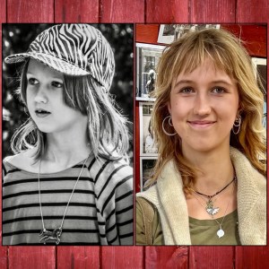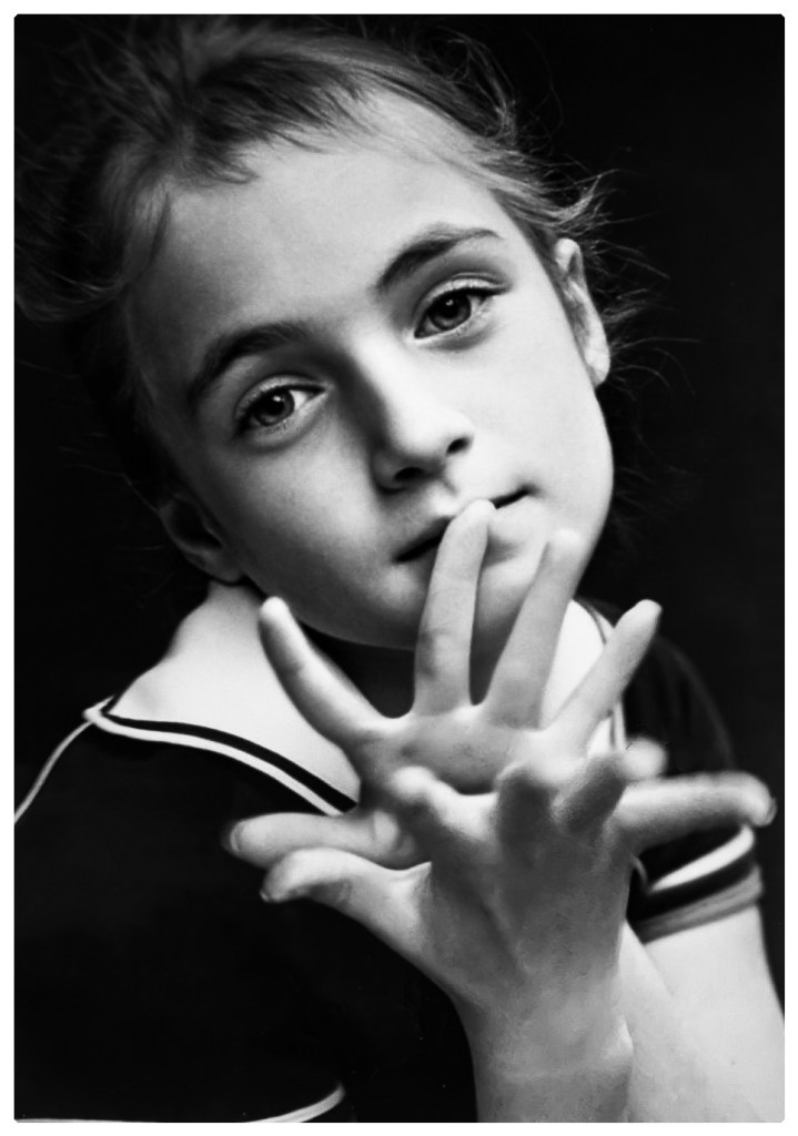 Där får de ibland göra vad de vill. Nina håller på med en berättelse om vitskallar. Nina har långt tjockt cendréfärgat hår över axlarna. Hennes ansikte är slätt och hennes mun tryggt leende.