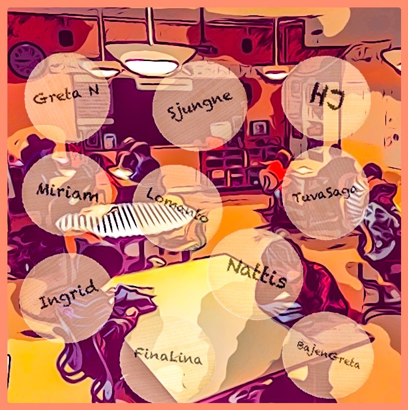 Från köket kommer saffransdoft. Linus, Nelly, Rebecka, Emely och Ludvig rullar små gula korvar. Viker ihop dem på fantasifulla sätt. Pillar i små ljusbruna russin.