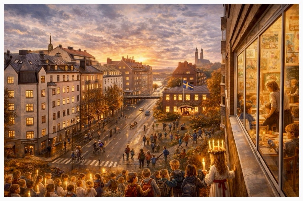 - Högtider: Luciafiranden i de stämningsfulla trapphusen och julavslutningar i Högalidskyrkan är återkommande motiv.