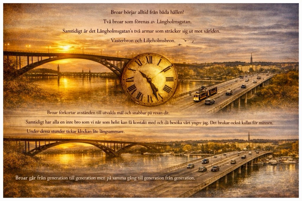 Vid den mindre Långholmsbron blir perspektivet mer intimt. Eftersom skribenten arbetat på Långholmsgatan 24 i över 40 år, är detta en plats för dagliga reflektioner. Bron är porten till Långholmens grönska och fungerar som en kontrast till Hornstulls urbana brus. Här finns minnen av utflykter med barnen från fritidshemmet och lugna stunder av återhämtning.